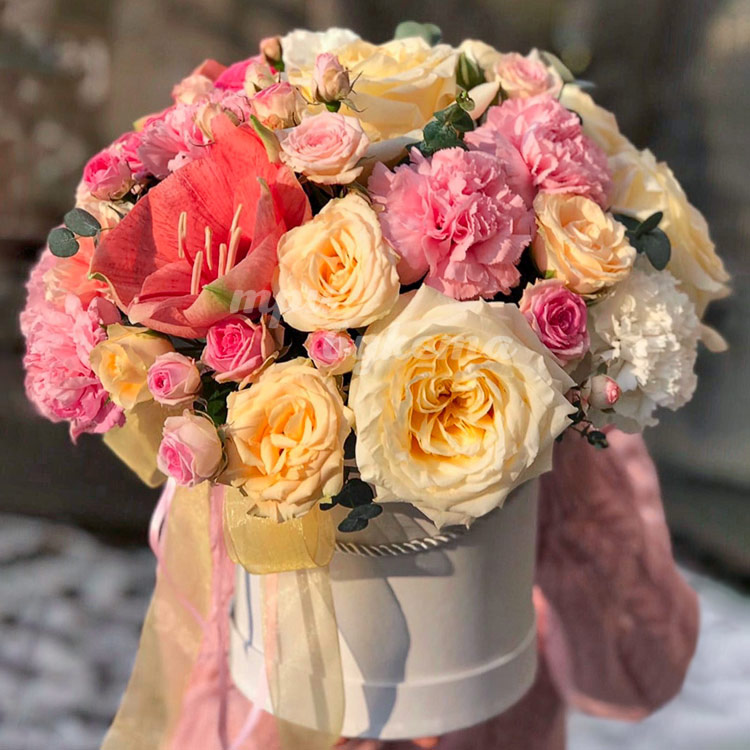 Амариллисы и гвоздики в коробке