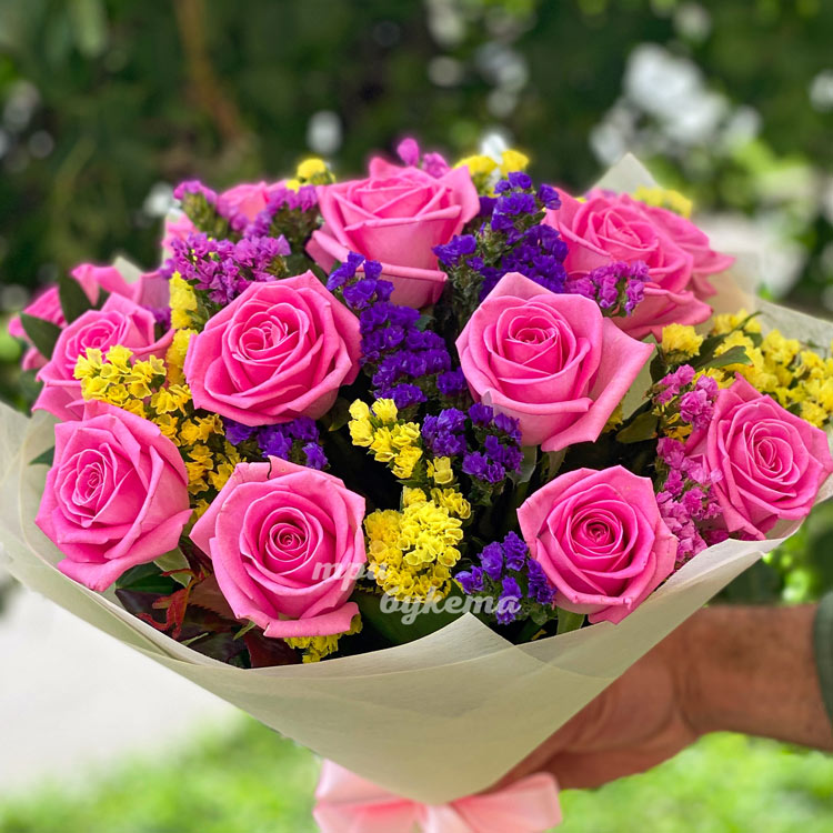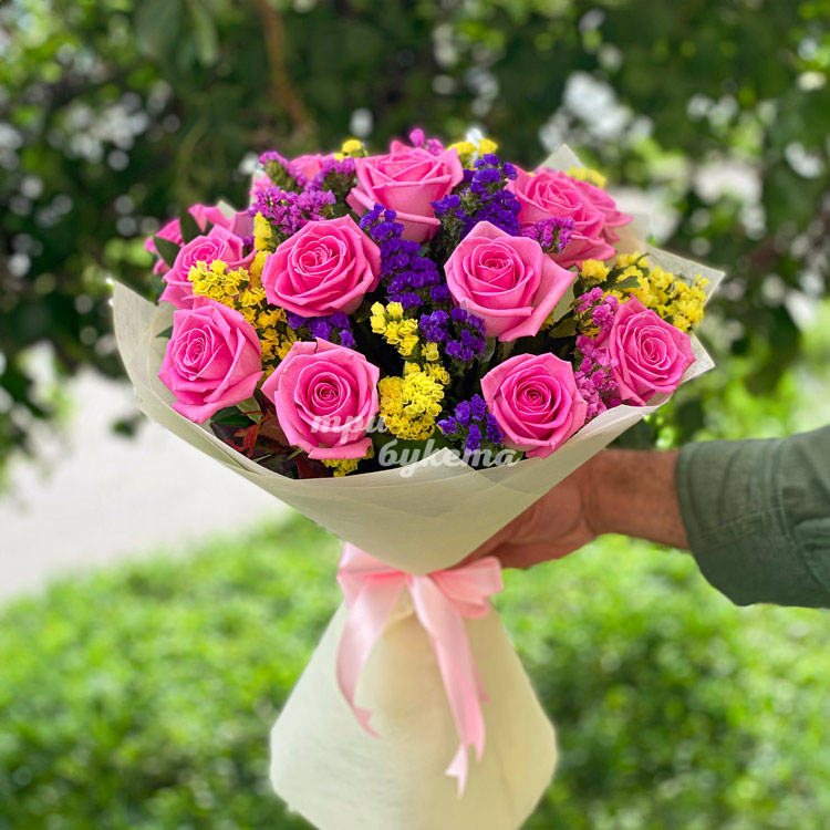 Букет 15 розовых роз с цветной статицей
