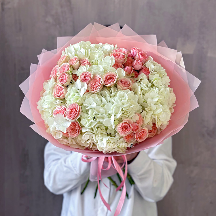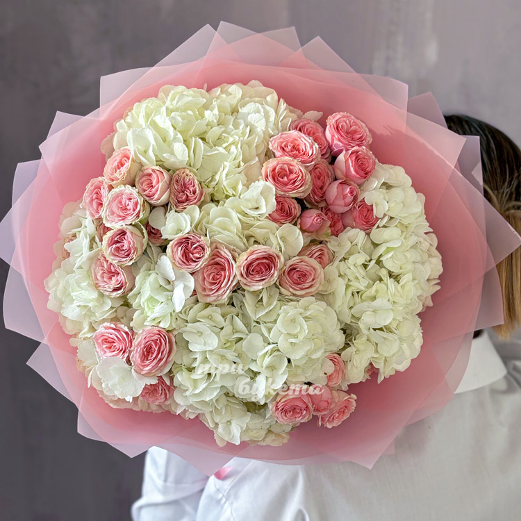 Букет белых гортензий и розовых кустовых роз