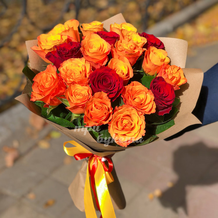 Букет из 21 красной и оранжевой розы
