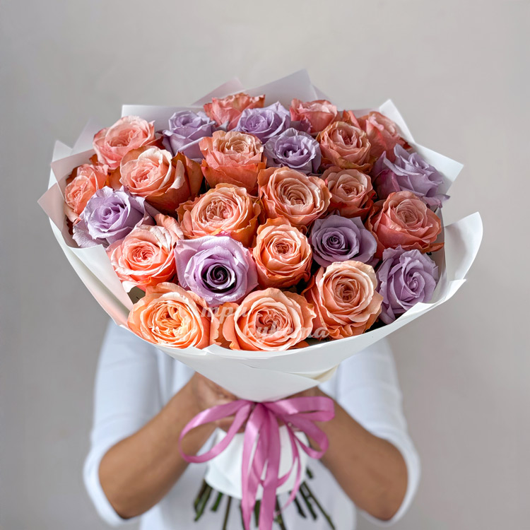 Букет из 25 персиковых и сиреневых роз