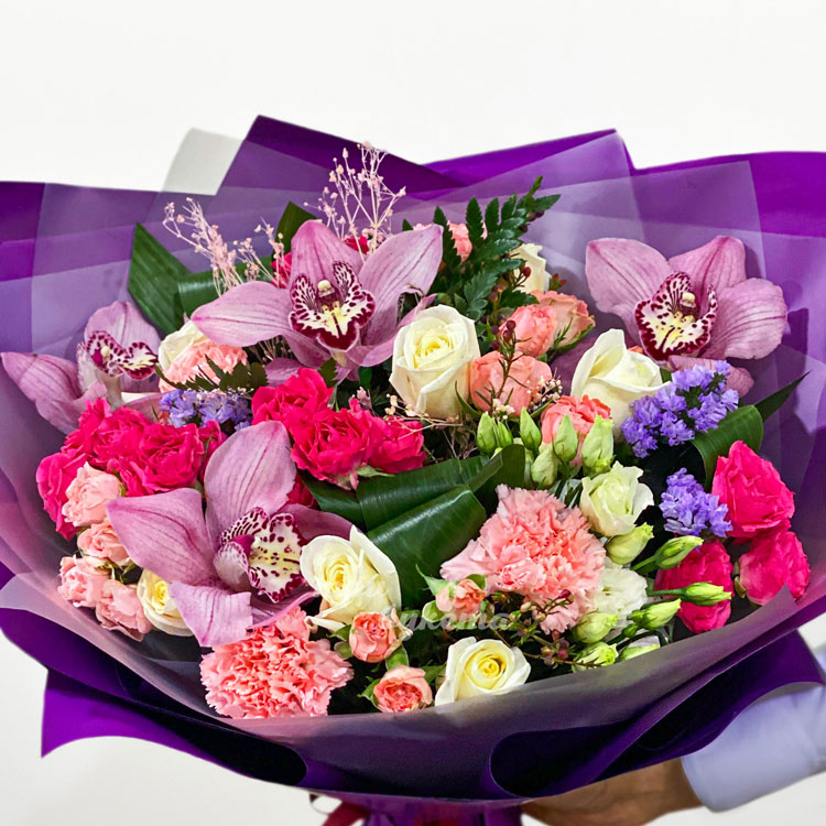 Букет из кустовых роз и орхидей