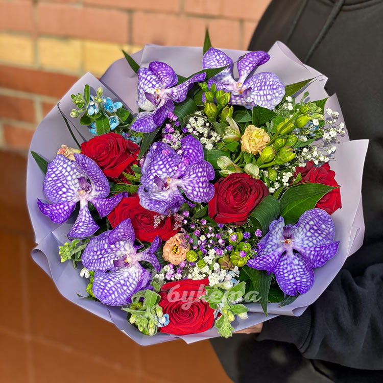 Букет красных роз с орхидеями Ванда