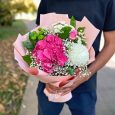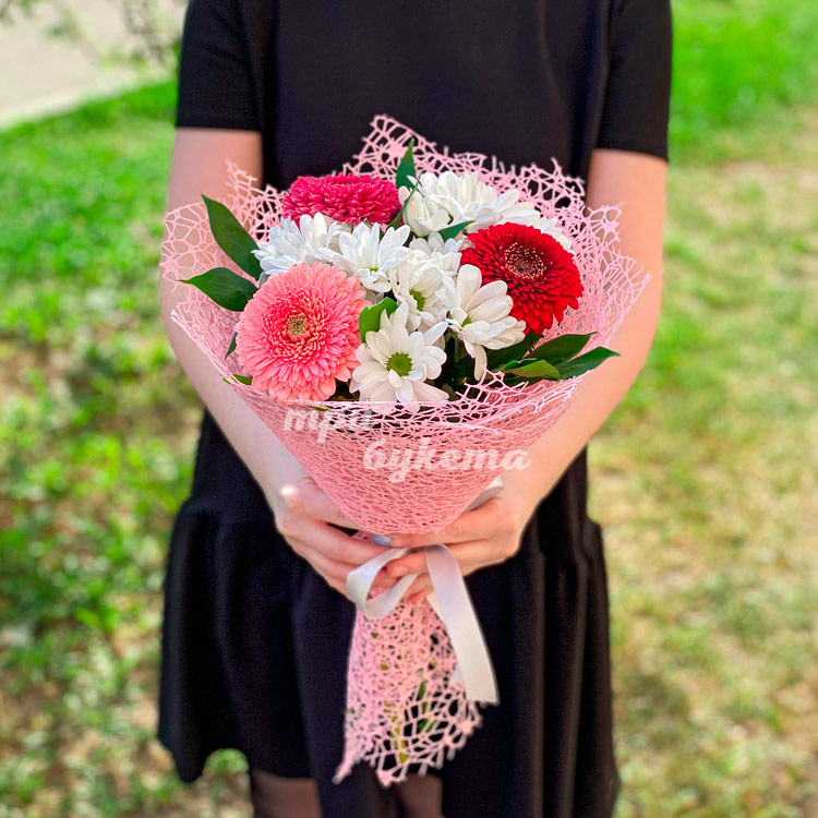 Герберы и хризантемы в розовом сизале