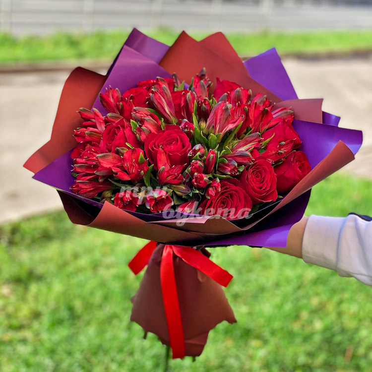 Красные альстромерии с красными розами