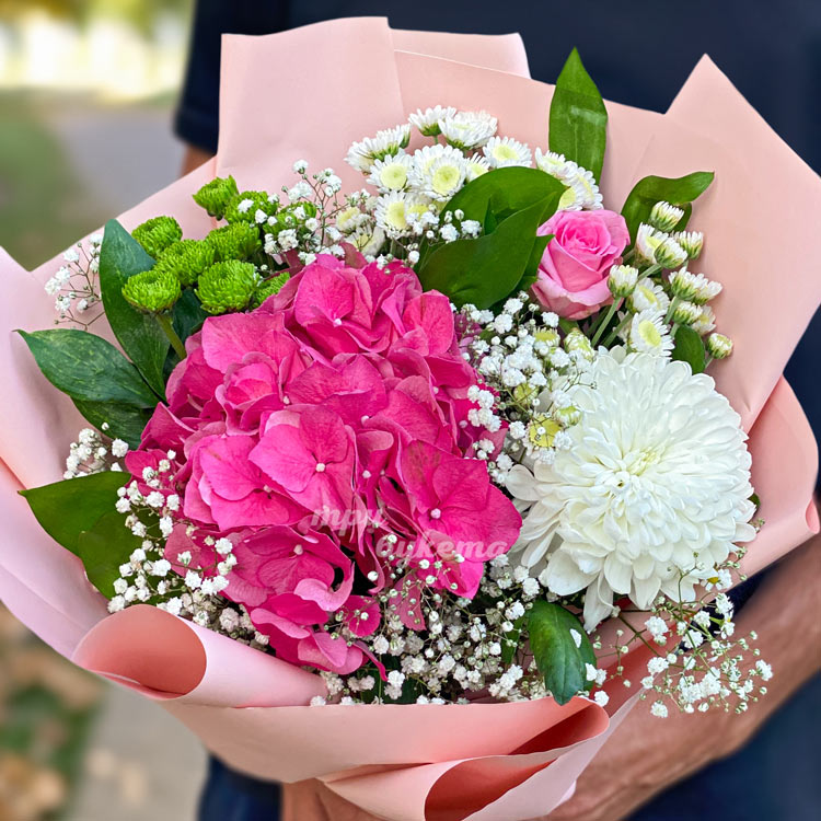 Розовый букет из хризантем и гортензии