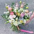 Розовый букет из тюльпанов и эустом