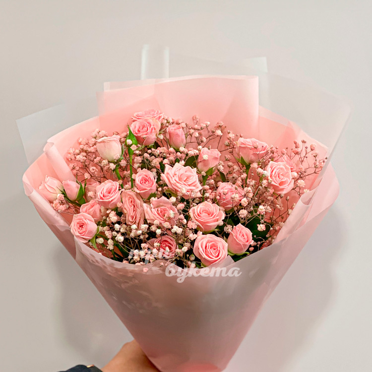 Розовый букет куст. роз с гипсофилой