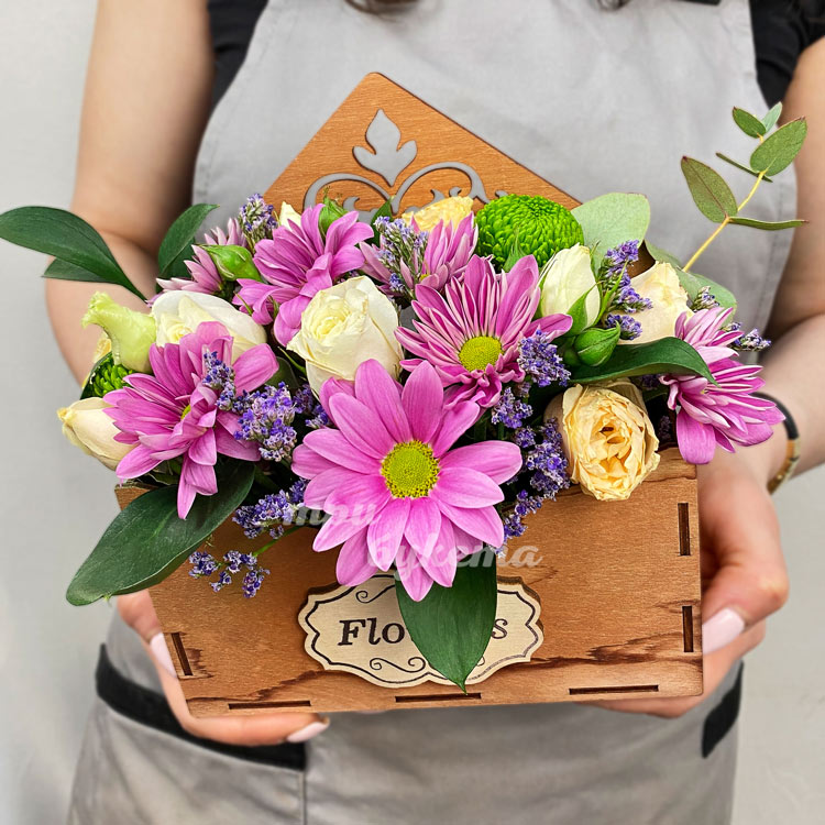 Розы и хризантемы в ящичке