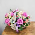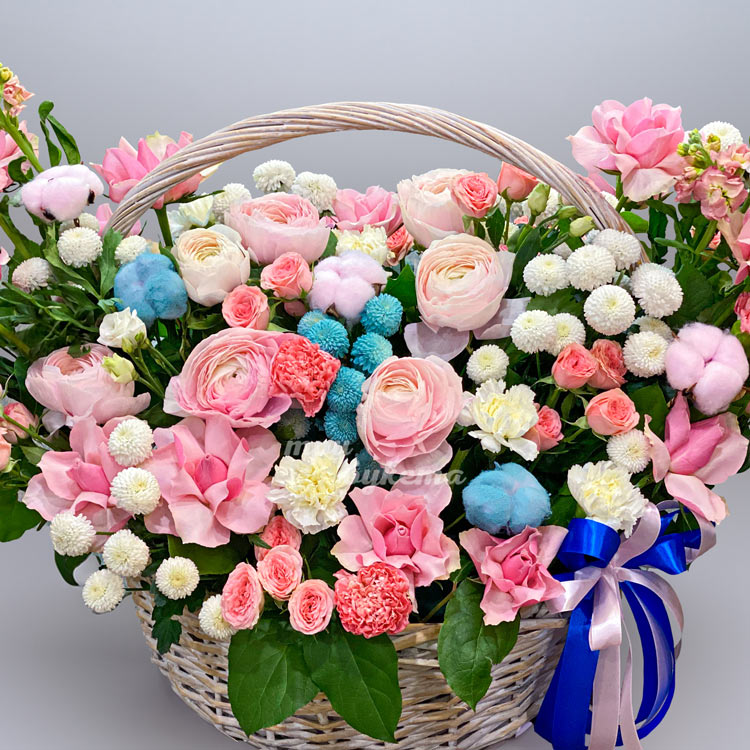 Яркая корзина хризантем, ранункулюсов и роз